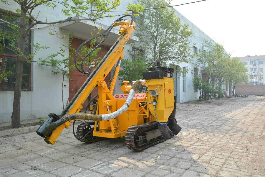 該系列履帶式潛孔鉆機主要用于露天礦山及石方工程鉆鑿下向傾斜爆破孔作業(yè)。該鉆機采用內燃機(或電動機)油泵組為動力,液壓馬達行走、回轉,液壓馬達鏈條推進及提升,油缸擺角定位,傳動結構簡單,易損件少,耗氣量低。